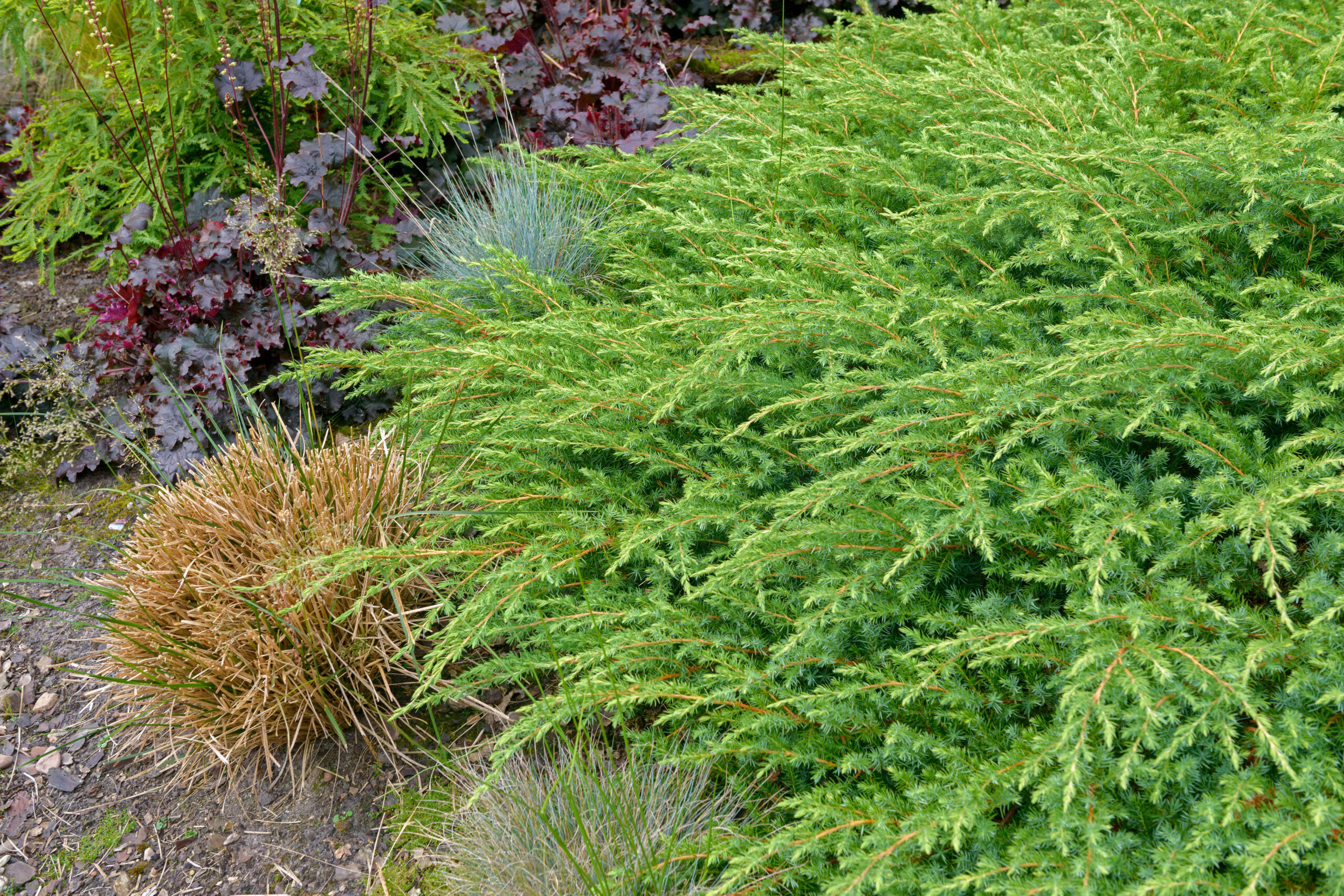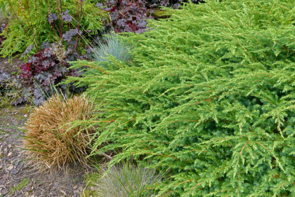 Juniperus Schlager thrives in a sunny position with well-drained soil. It is especially happy in containers or sheltered garden spots where its shape can be appreciated all year round.